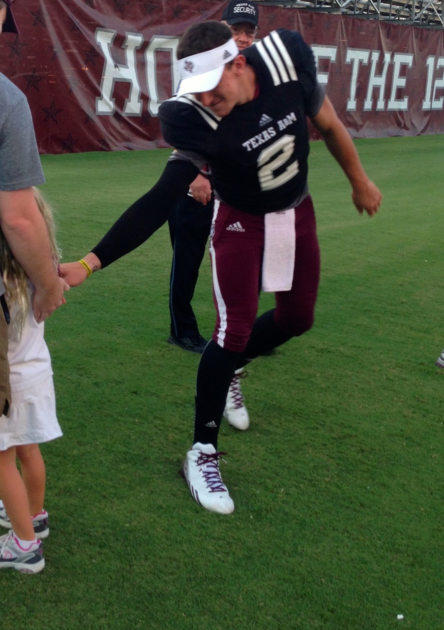 Johnny Manziel flirting with our youngest when she was too shy to shake his hand. Either that or he was taunting her for not being able to stop him. He did point to the scoreboard after this…